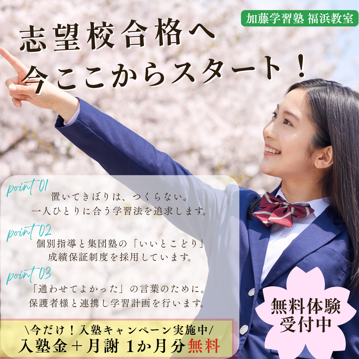成績が向上しなければ、無料で個別指導も受けられます。